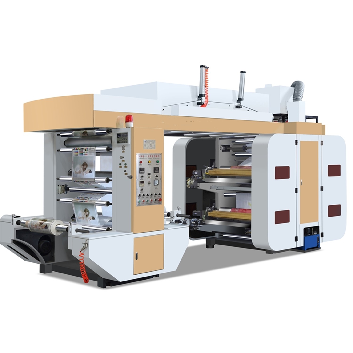 This machine is a printing machine using a photosensitive resin soft plate as a plate material, commonly known as "flexographic printing machine", "embossing printing machine", "flexo printing machine". Suitable for printing polyethylene, polypropylene, cellophane, plastic film (BOPP OPP PE PVC PET, etc.), non-woven fabric, woven bag, paper and other packaging materials, is food packaging, supermarket handbags, vest bags, clothing bags and other flexible packaging Ideal printing equipment.