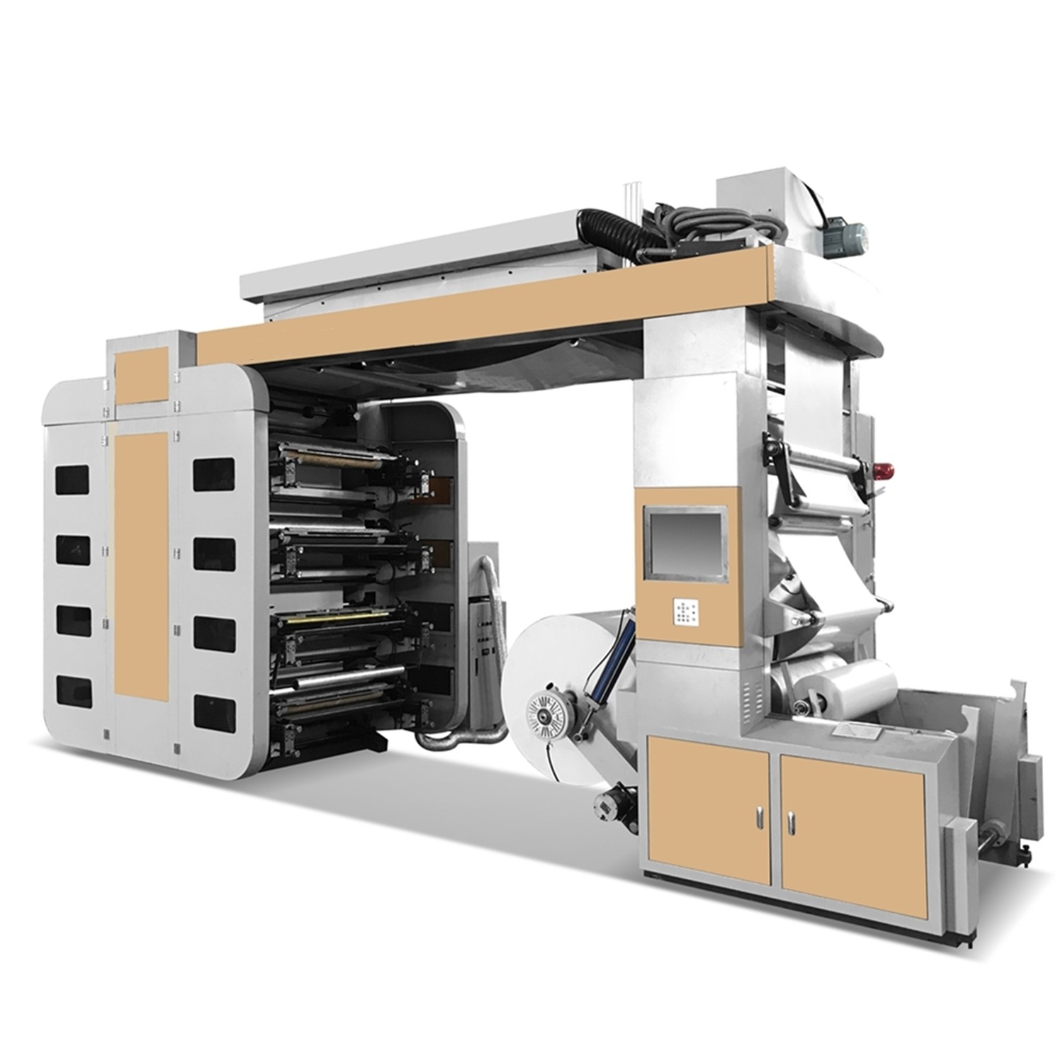 This machine is a printing machine using a photosensitive resin soft plate as a plate material, commonly known as "flexographic printing machine", "embossing printing machine", "flexo printing machine". Suitable for printing polyethylene, polypropylene, cellophane, plastic film (BOPP OPP PE PVC PET, etc.), non-woven fabric, woven bag, paper and other packaging materials, is food packaging, supermarket handbags, vest bags, clothing bags and other flexible packaging Ideal printing equipment.